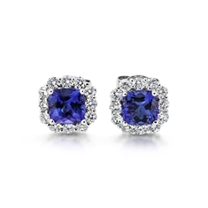 A timeless pair of cushion cut tanzanites weighing 2.46ct are claw set at the centre of each ear. They are framed with a single border of sparkling G SI quality brilliant cut diamonds which have a combined weight of 1.13ct in total. Crafted in 18ct white gold they fasten to the ear with traditional post and butterfly fittings. Explore our stunning collection of tanzanite and diamond earrings available in a wide variety of gemstone shapes and setting styles.